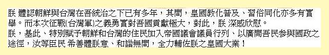 1937年依照萬國公法實施「皇民化」,1945年4月1日台灣、澎湖地區全面實施帝國憲法,從此,依照萬國公法,台灣、澎湖脫離殖民地,正式編入大日本帝國國土。人民享有大日本帝國參政權、參戰權,為大日本帝國合法公民。